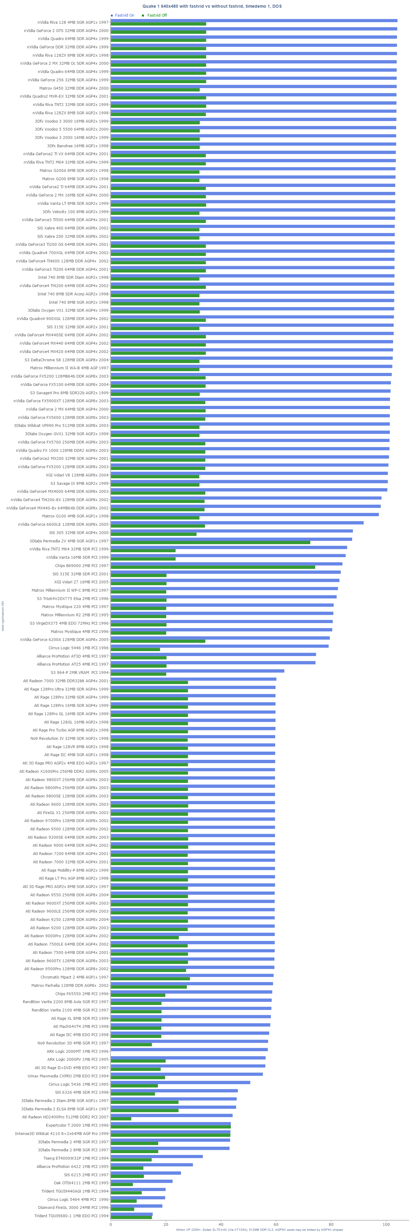 Athlon XP 2200+, Soltek SL75-KAV (Via KT133A), 512MB SDR CL3. AGP8X cards may be limited by AGP4X chipset. Quake 1 640x480 without and with fastvid, timedemo 1, DOS.
